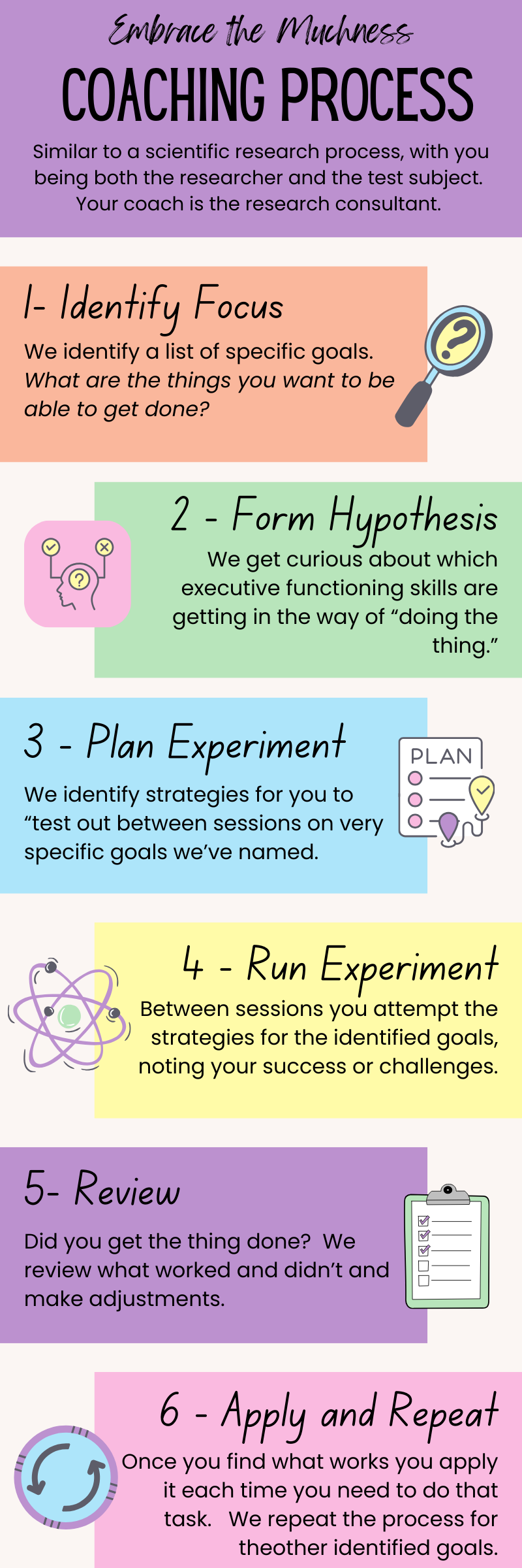 Individual coaching is designed for adults with ADHD and others who struggle with executive functioning skills. No formal diagnosis is needed.